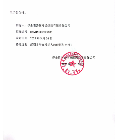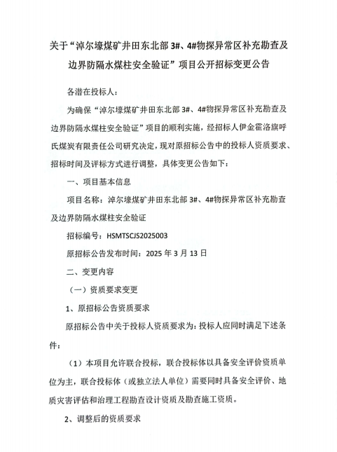 關于“淖爾壕煤礦井田東北部3#、4#物探異常區補充勘察及邊界防隔水煤柱安全驗證”項目公開招標變更公告